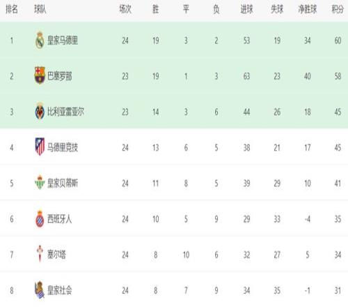 在积分榜上,皇马以60分排名榜首。皇马的战绩是19胜3平2负。巴萨则以58分屈居第2名。不过,巴萨比皇马少踢1轮,接下来有机会重登榜首。比利亚雷亚尔45分排名第3。马竞惨败之后,依然是45分,但净胜球比比利亚雷亚尔少,跌到了第4名。皇家贝蒂斯赢球后,总积分是41分,继续缩小与身前球队的差距,排名第5,距离欧冠区越来越近。西班牙人拿到35分,排名第6。